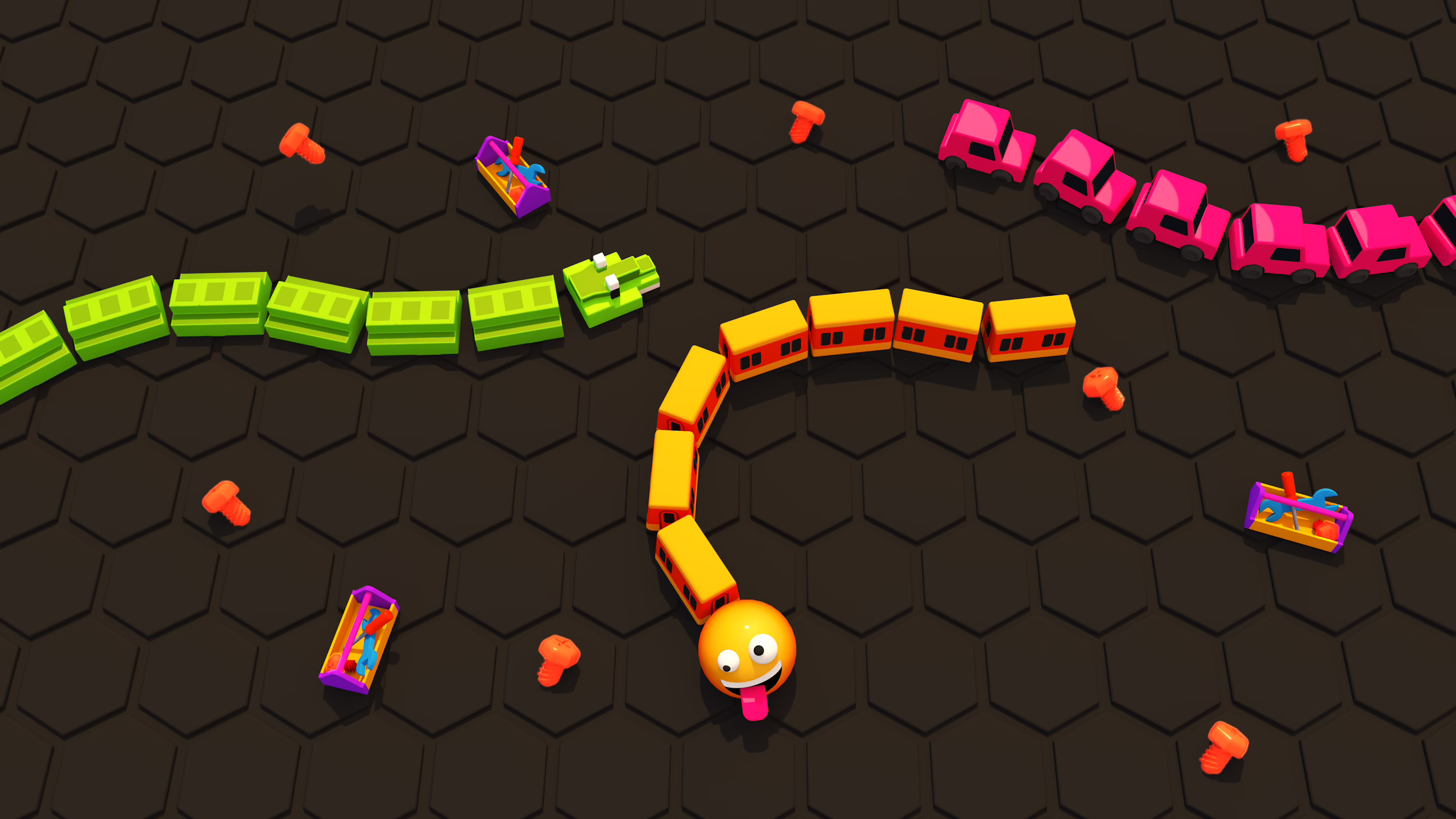 The main goal is simple but exciting — eat smaller trains, collect screws and toolboxes, and grow longer to dominate the arena.